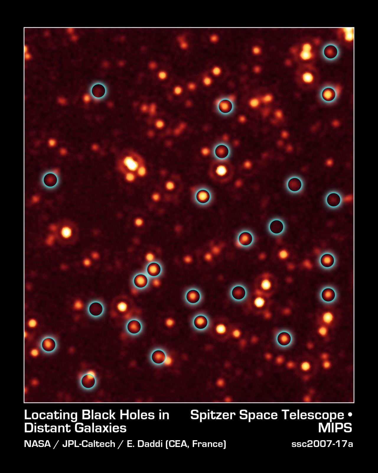 Astronomers have unmasked hundreds of black holes hiding deep inside dusty galaxies billions of light-years away. Some of the objects are seen here in this section of the GOODS survey.