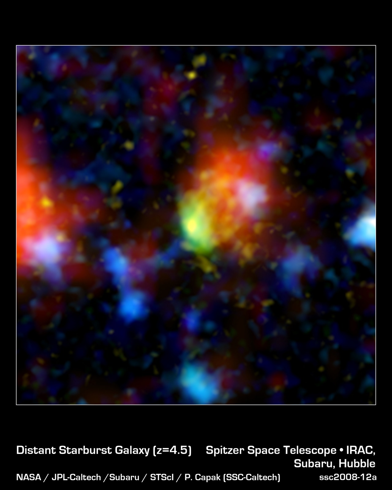 The green and red splotch in this image is the most active star-making galaxy in the very distant universe. Nicknamed "Baby Boom," the galaxy is churning out an average of up to 4,000 stars per year, more than 10 times the number produced in our own Milky Way galaxy.