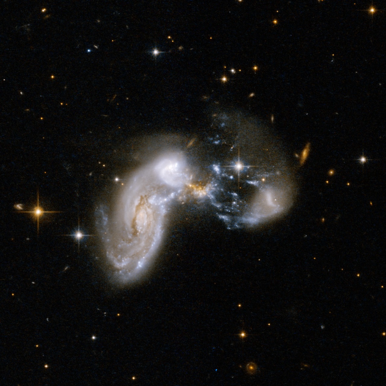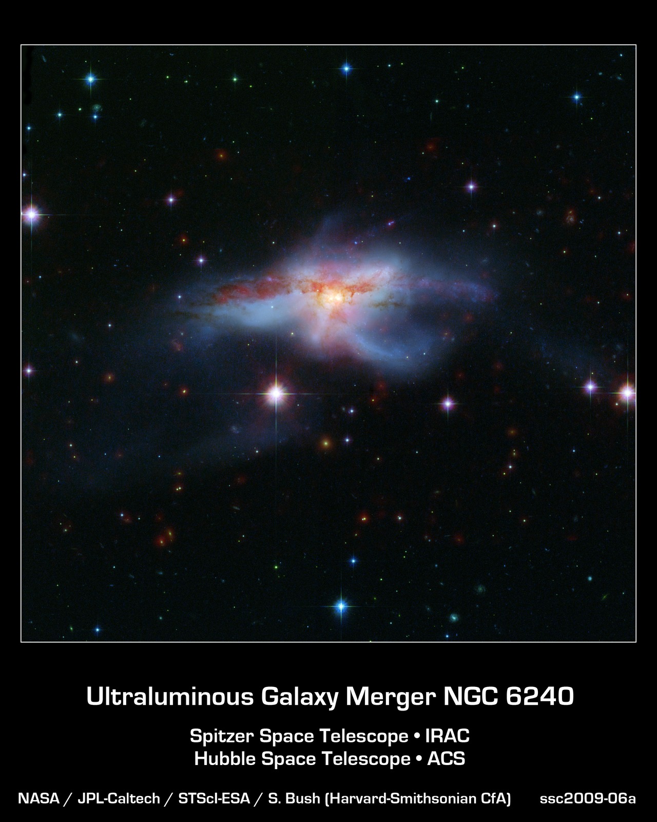 This image of a pair of colliding galaxies called NGC 6240 shows them in a rare, short-lived phase of their evolution just before they merge into a single, larger galaxy.