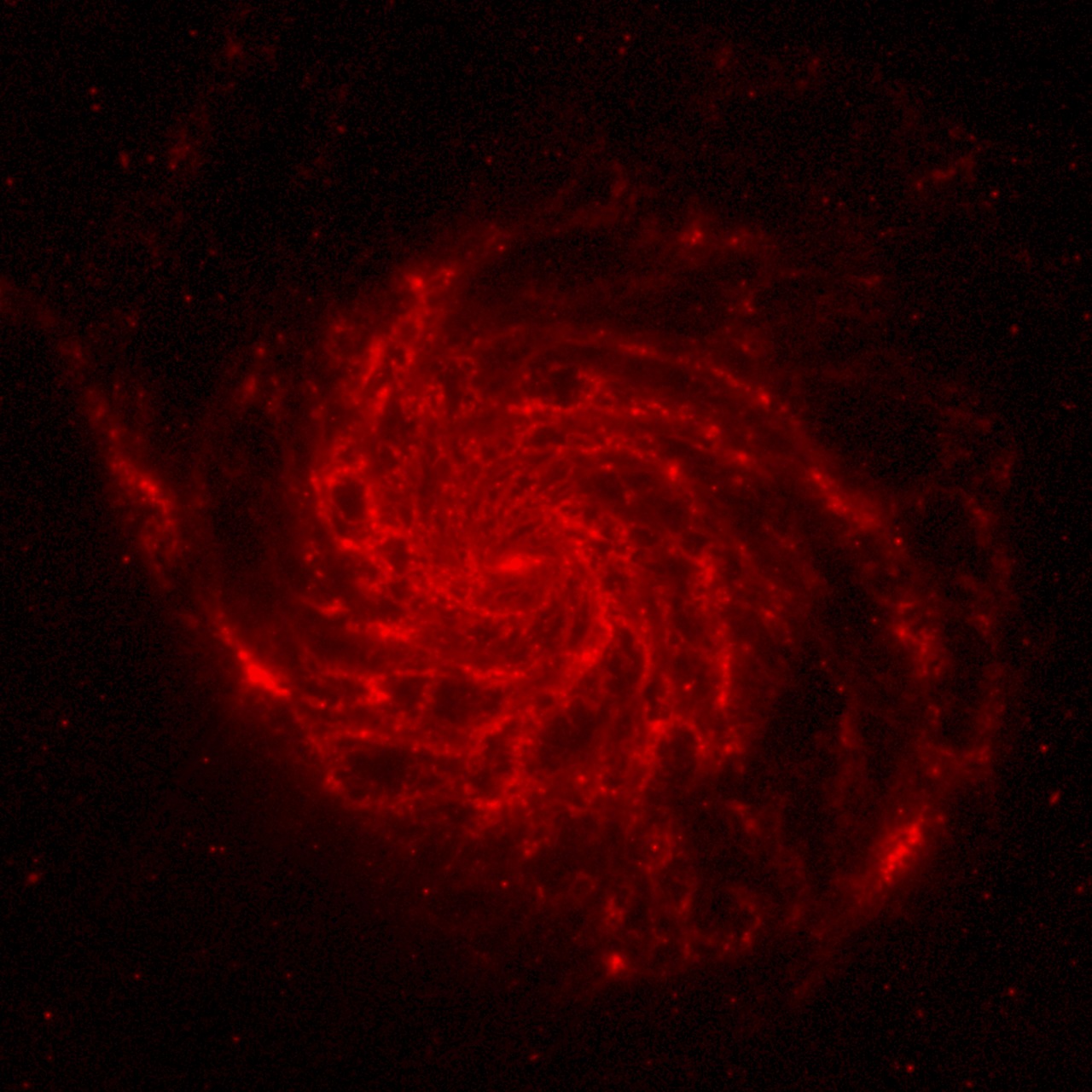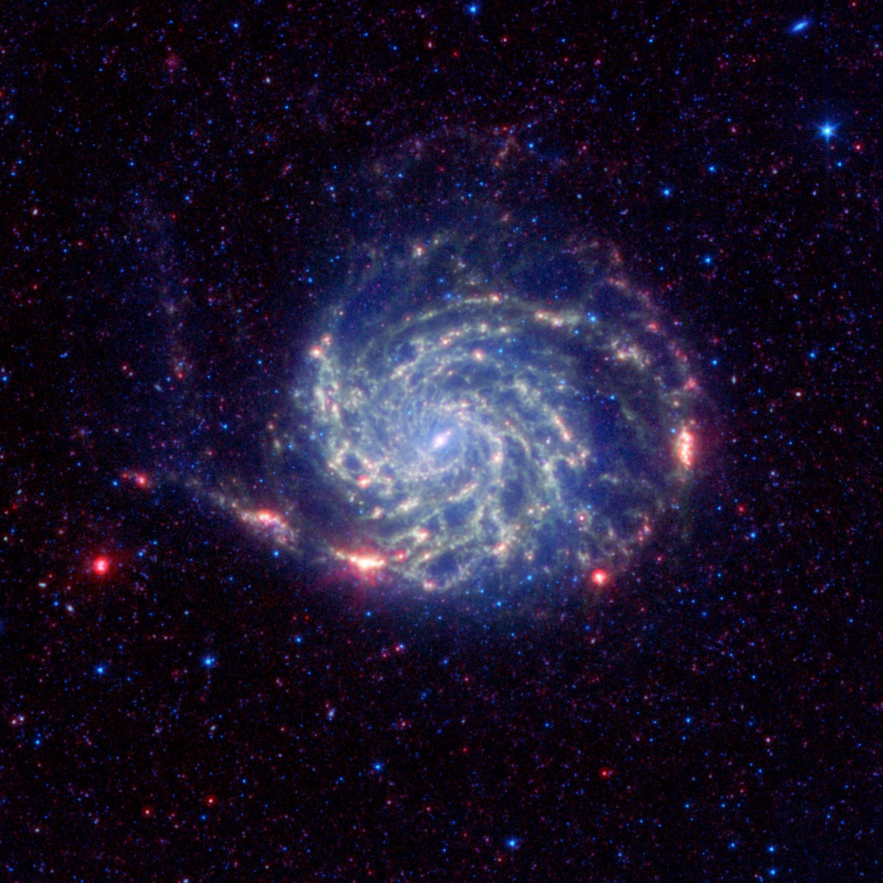 The Pinwheel galaxy, or Messier 101, sports bright reddish edges in this infrared image. Research from NASA's Spitzer Space Telescope has revealed that this outer red zone lacks organic molecules present in the rest of the galaxy.
