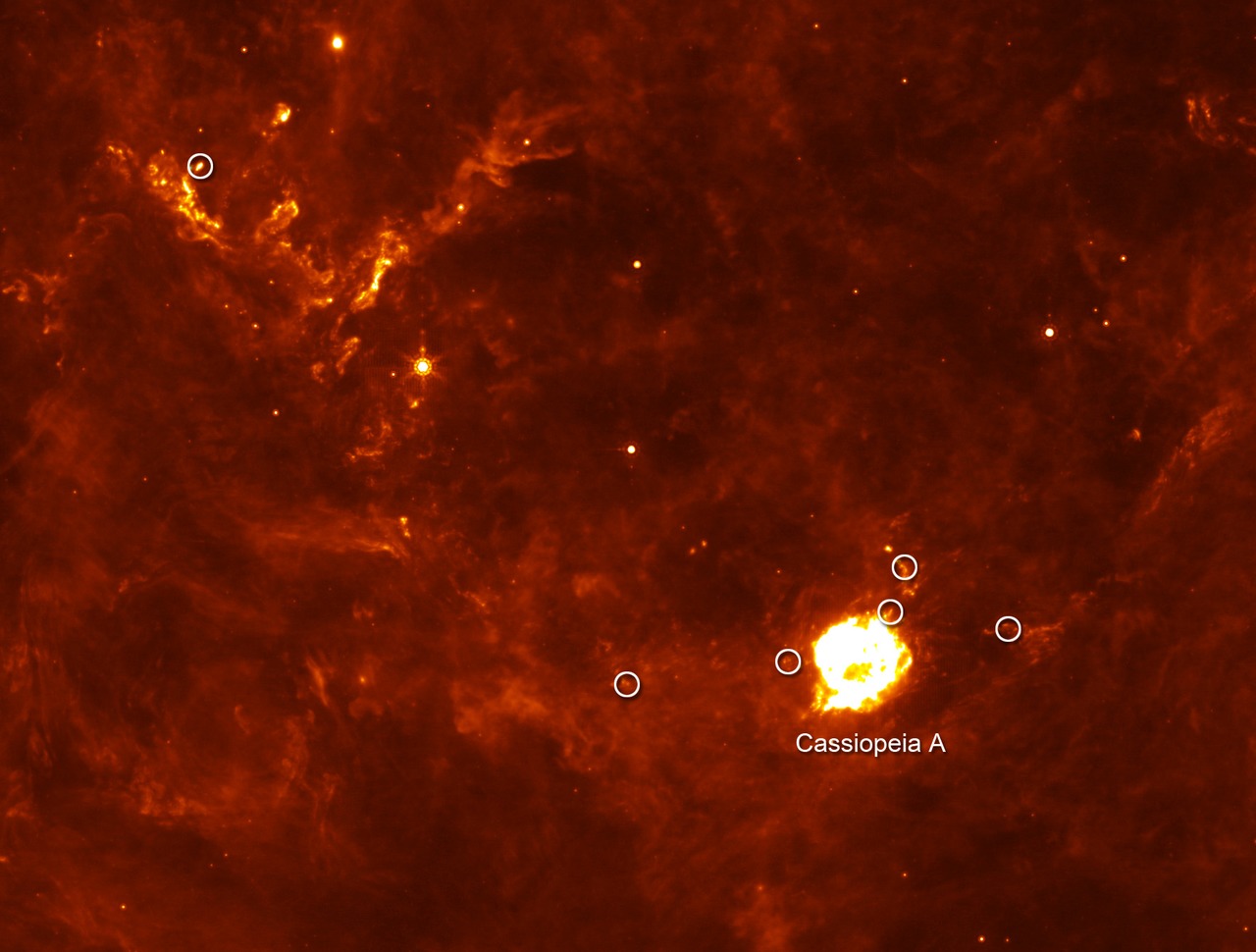 The Cassiopeia A supernova's first flash of radiation makes six clumps of dust (circled) unusually hot.