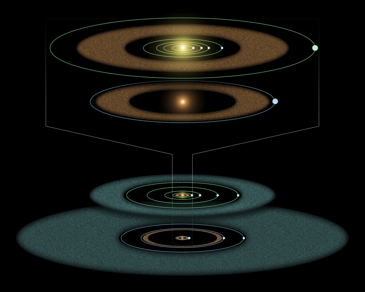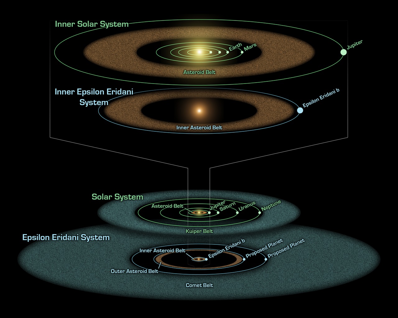 This artist's diagram compares the Epsilon Eridani system to our own solar system. The two systems are structured similarly, and both host asteroids (brown), comets (blue) and planets.