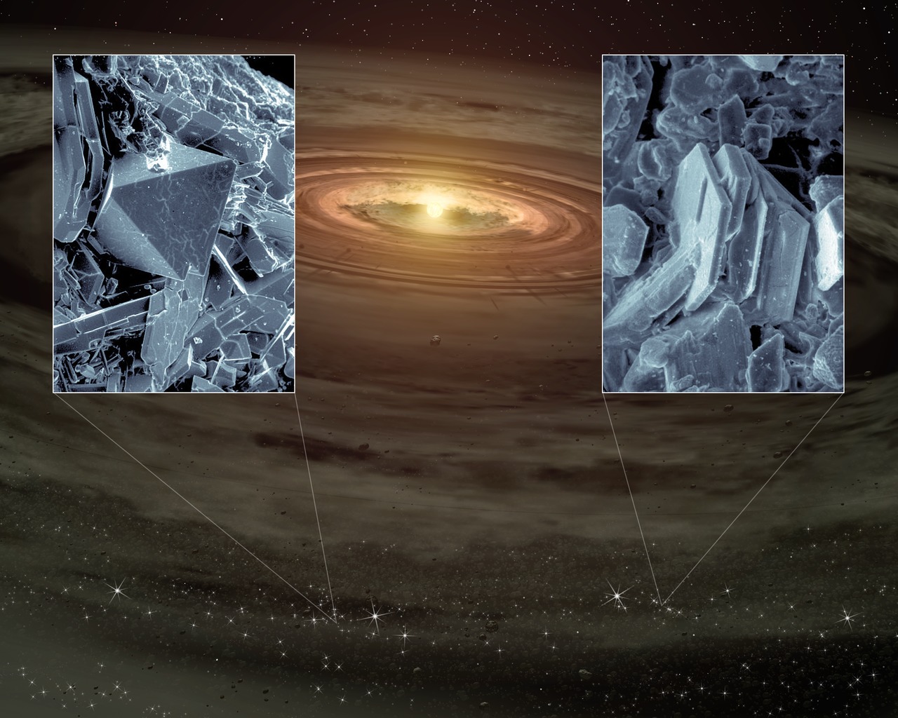 This artists concept of a young star and its planet forming disk shows tiny quartz like crystals detected by the Spitzer Space Telescope. The crystals, which are types of silica minerals called cristobalite and tridymite, can be seen close-up in the black-and-white insets.