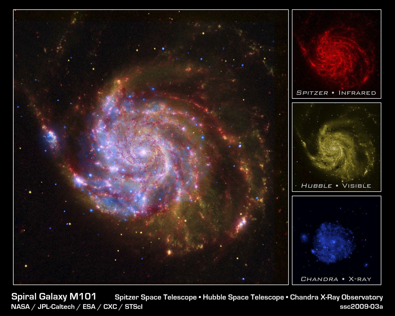 This image of the spiral galaxy Messier 101 is a composite of views from Spitzer, Hubble, and Chandra.