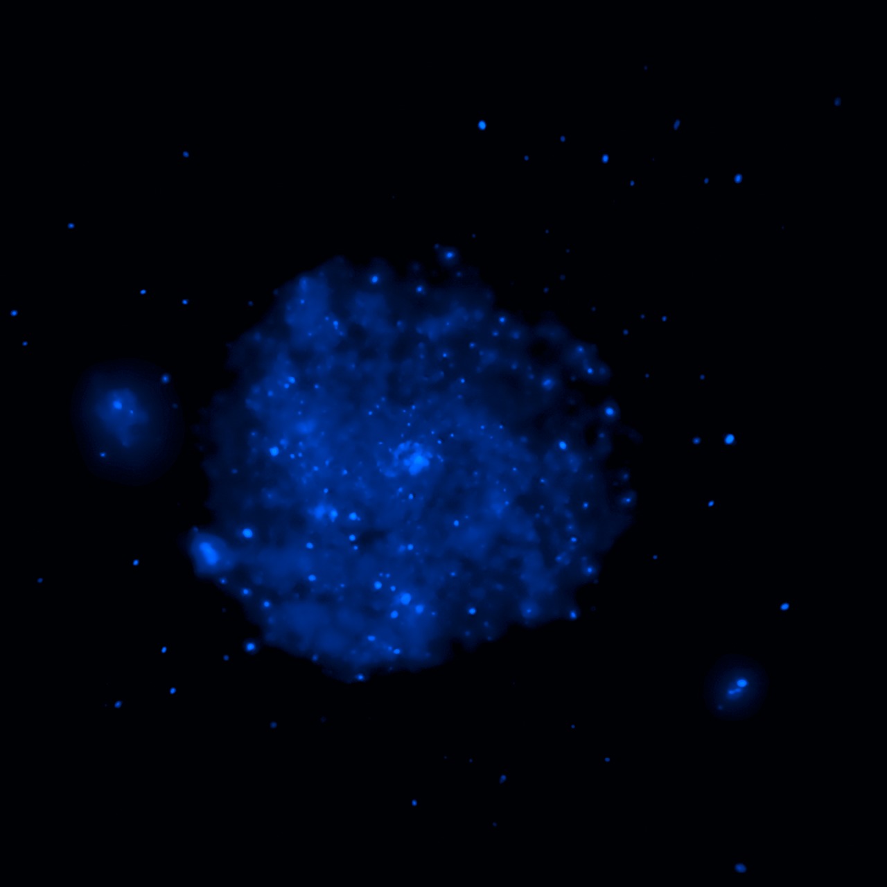 The blue color shows Chandra's view in X-ray light. Sources of X-rays include million-degree gas, exploded stars, and material colliding around black holes.