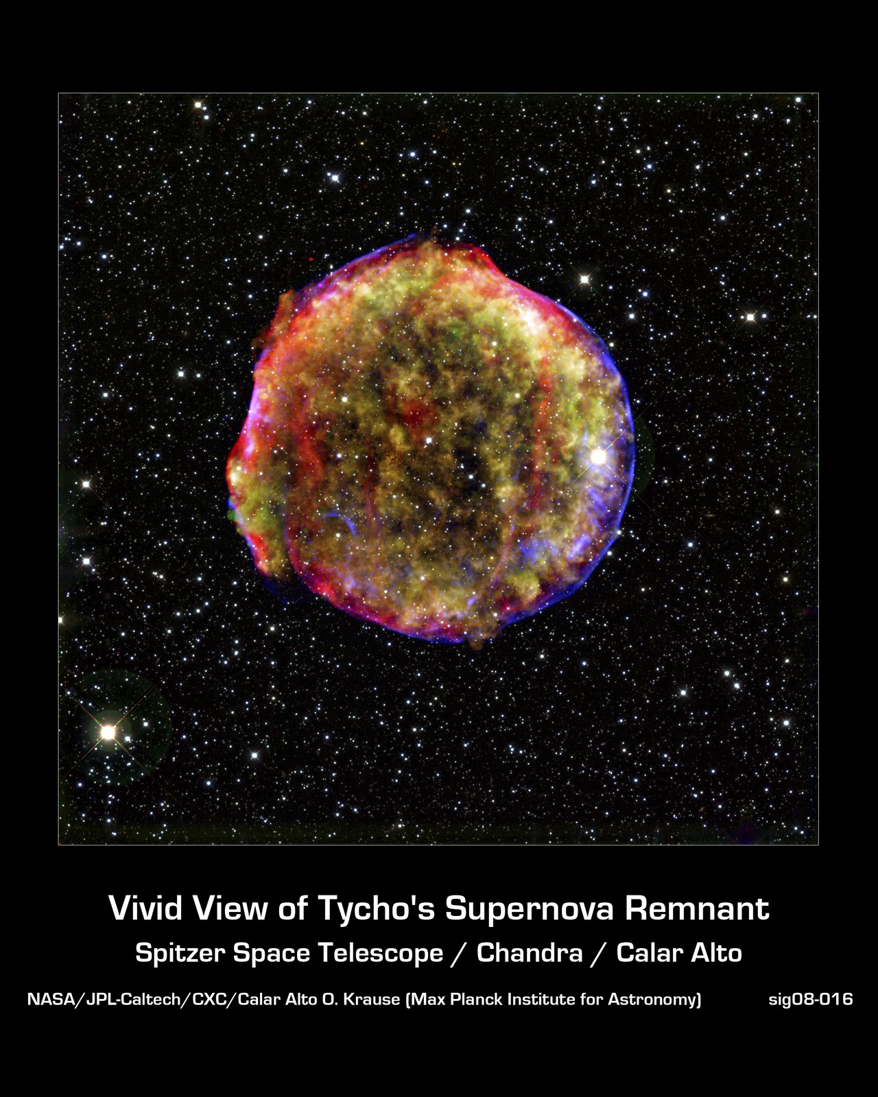 This composite image of the Tycho supernova remnant combines infrared and X-ray observations obtained with NASA's Spitzer and Chandra space observatories, respectively, and the Calar Alto observatory, Spain.