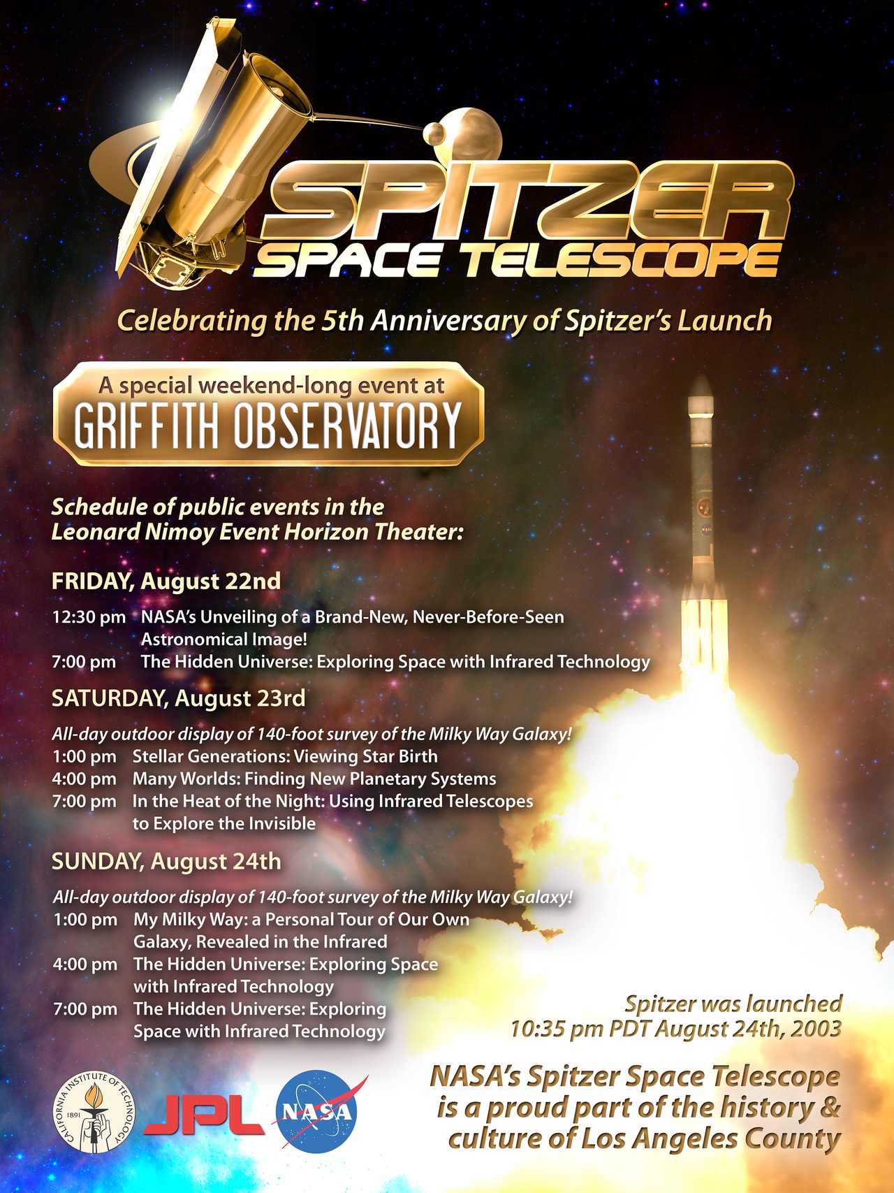 A poster created for the celebration of the 5th anniversary of the launch of NASA's Spitzer Space Telescope at Griffith Observatory in Los Angeles.