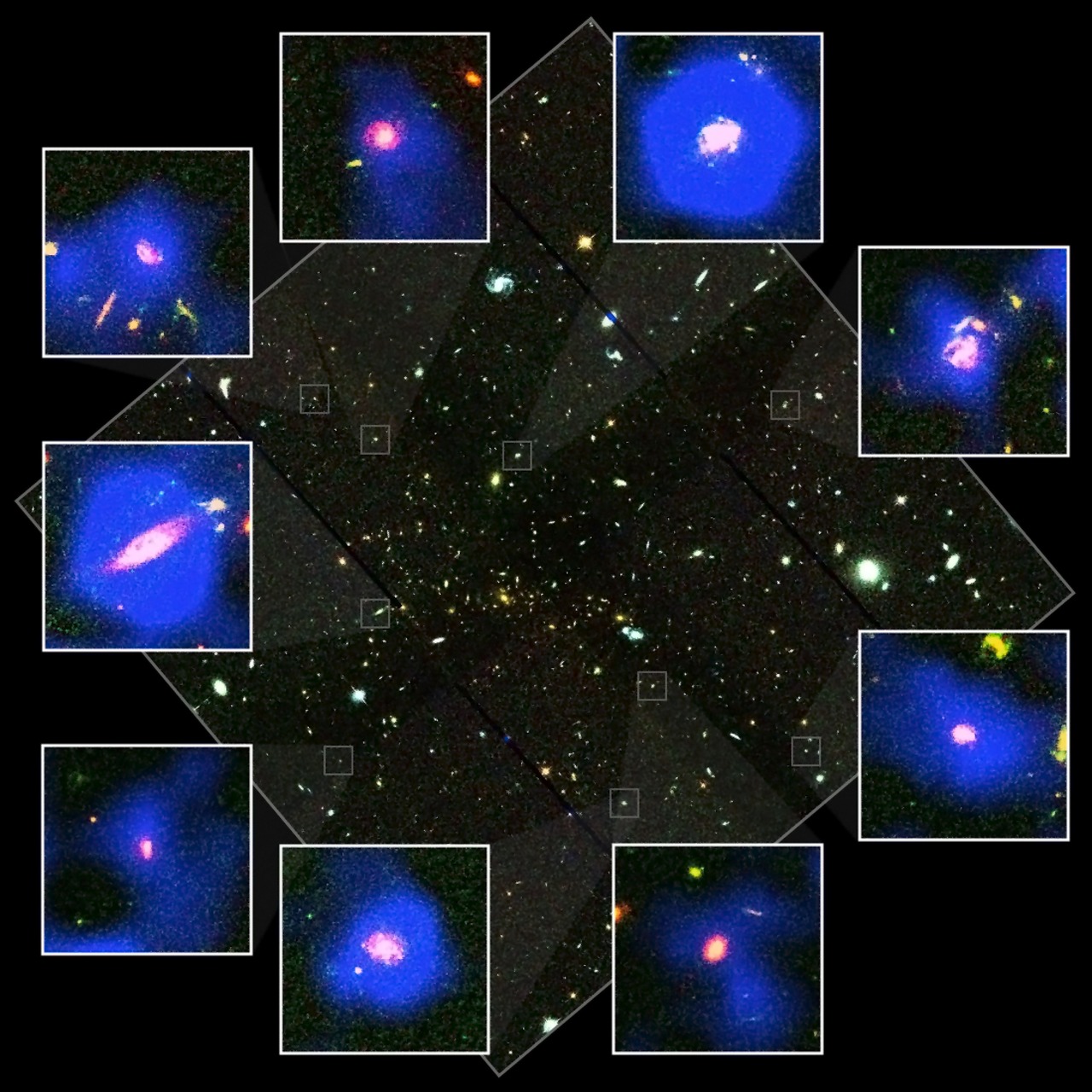 A Hubble Space Telescope snapshot of galaxy cluster MS1054 is featured in the center of this image, with individual galaxies spotted by the Spitzer Space Telescope are highlighted along the side in call-out images.