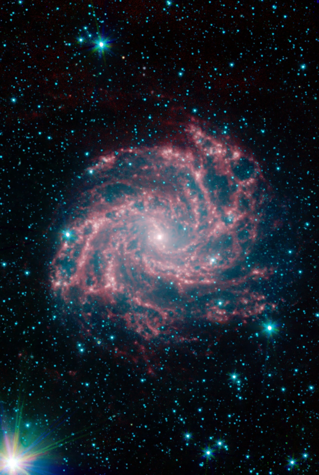 NGC 6946, or "The Fireworks Galaxy", is one of about a dozen nearby neighbors to the Milky Way. It is located approximately 10 million light-years away in the Cepheus constellation. This image was captured as part of the Spitzer Infrared Nearby Galaxy Survey.