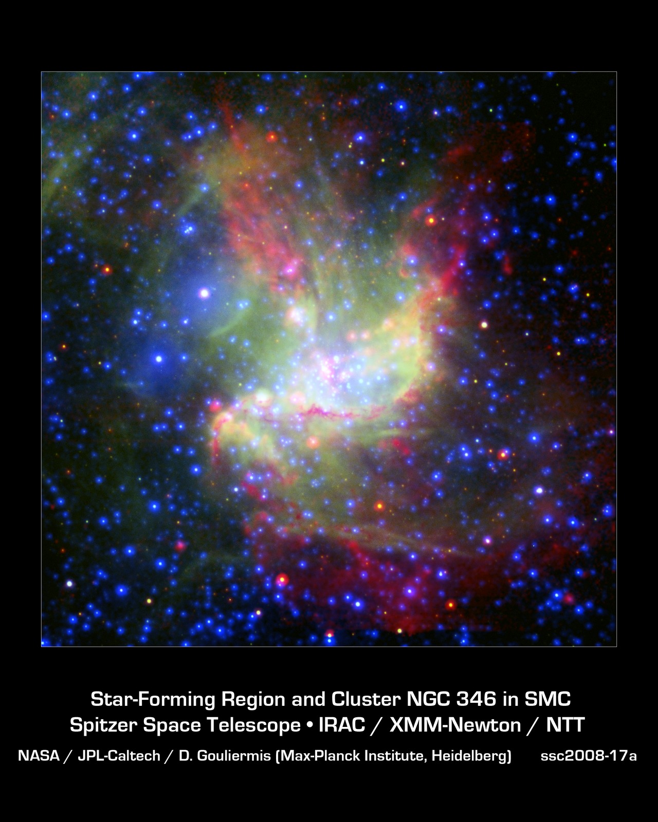 This painterly portrait of a star-forming cloud, called NGC 346, is a combination of multiwavelength light from NASA's Spitzer Space Telescope (infrared), the European Southern Observatory's New Technology Telescope (visible), and the European Space Agency's XMM-Newton space telescope (X-ray).