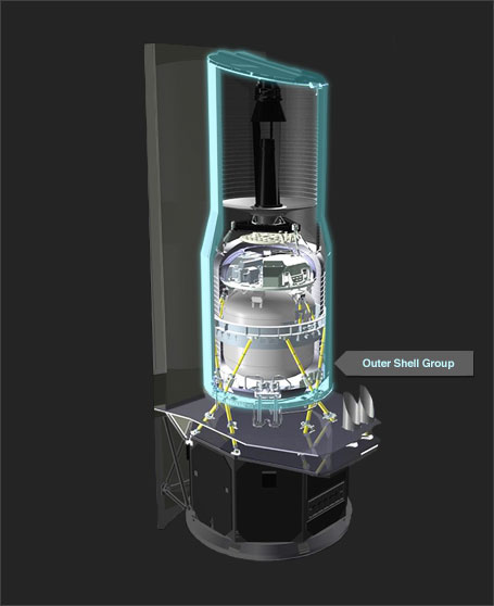 The outer shell of the Cryostat Telescope Assembly was made of a dust cover, an outer shield (cooled by helium vapor from the cryostat), thermal shields (which blocked radiation from space), and solar panels to provide power to the spacecraft. The outer shell surrounded the telescope and the cryostat (with all of the instruments inside). It prevented heat from the Sun and the rest of the spacecraft from reaching the cold telescope and instruments by radiating it away into space.