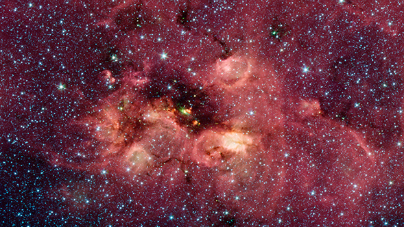 This image was submitted by @kevinmgill, who named it "Nebula Does Not Approve." While we fully appreciate a good Grumpy Cat reference, we also showed it to the rest of the Spitzer public affairs team, who collectively have spotted a woolly mammoth, a fish, a raccoon, a Minecraft Creeper and a "cute coyote, cocking his head in a really inquisitive way." How about you? Do you see any of these, or does your imagination show you something entirely different?