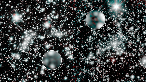 A second paper generated by the SURFS UP team involves the magnification of a galaxy by the massive Bullet Cluster of galaxies. The paper, in The Astrophysical Journal Letters, describes an extremely distant galaxy, 12.9 billion light years away, which is so faint that Spitzer could only detect it using the extra boost of a foreground gravitational lens. Careful analysis of the stellar properties of this galaxy suggests it also harbors stars of an already reasonably advanced age.