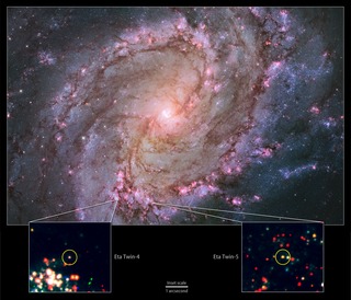 In a follow-on survey in 2015, the team found two candidate Eta twins in the galaxy M83, located 15 million light-years away, and one each in NGC 6946, M101 and M51, located between 18 and 26 million light-years away. These five objects mimic the optical and infrared properties of Eta Carinae, indicating that each very likely contains a high-mass star buried in five to 10 solar masses of gas and dust. Further study will let astronomers more precisely determine their physical properties. The findings were published in the Dec. 20 edition of The Astrophysical Journal Letters.