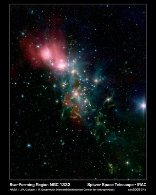 The young stars in NGC 1333 do not form a single cluster, but are split between two sub-groups. One group is to the north near the nebula shown as red in the image. The other group is south, where the features shown in yellow and green abound in the densest part of the natal gas cloud. With the sharp infrared eyes of Spitzer, scientists can detect and characterize the warm and dusty disks of material that surround forming stars. By looking for differences in the disk properties between the two subgroups, they hope to find hints of the star- and planet-formation history of this region.