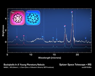 PASADENA, Calif. - Astronomers using NASA's Spitzer Space Telescope have discovered carbon molecules, known as "buckyballs," in space for the first time. Buckyballs are soccer-ball-shaped molecules that were first observed in a laboratory 25 years ago.