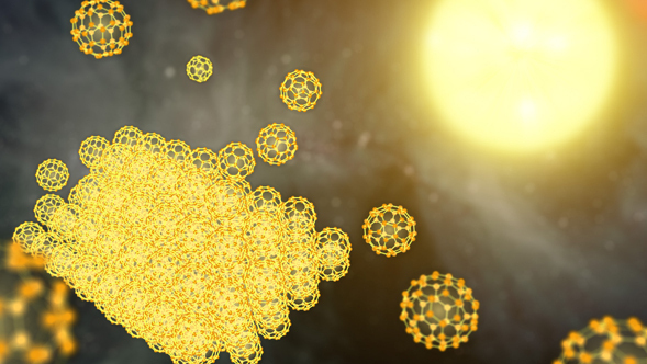 "These buckyballs are stacked together to form a solid, like oranges in a crate," said Nye Evans of Keele University in England, lead author of a paper appearing in the Monthly Notices of the Royal Astronomical Society. "The particles we detected are minuscule, far smaller than the width of a hair, but each one would contain stacks of millions of buckyballs."