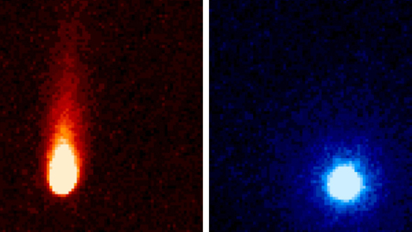 Images captured June 13 with Spitzer's Infrared Array Camera indicate carbon dioxide is slowly and steadily "fizzing" away from the so-called "soda-pop comet," along with dust, in a tail about 186,400 miles (300,000 kilometers) long.