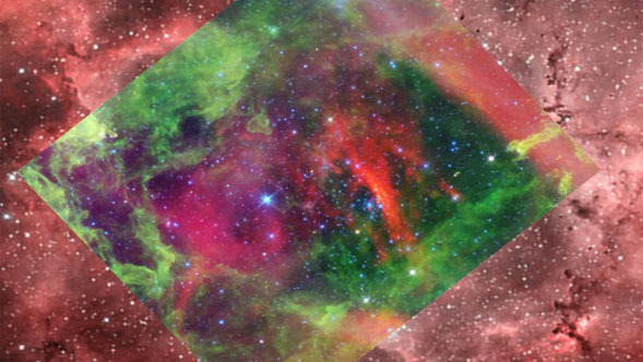 Some of the Rosette's most massive stars, called O-stars, can be seen inside the bubble-like, red cavity as bright blue stars; however, the largest two blue stars in this picture are in the foreground, and not in the nebula itself. Radiation and winds from the super hot stars have collectively blown layers of dust (green) and gas away, revealing the cavity of cooler dust (red).