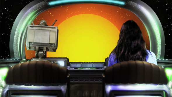 Cameron Diaz teaches Robot IR-2 (Ed Wasser) how astronomers can measure the mass of asteroids from tremendous distances.